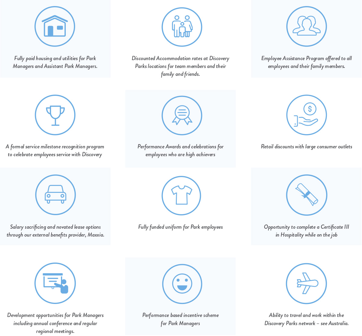 We employ people in our Park locations in the full range of roles from entry level housekeeping, front office and grounds, through to park management level and beyond. We have an appetite for developing and growing our own talent, so it is not uncommon to see employees move through the business on upward career paths or across different locations. Discovery Parks staff around Australia are supported by a dedicated Support Office team in Adelaide who provide assistance in operations, finance, marketing, IT and human resources.